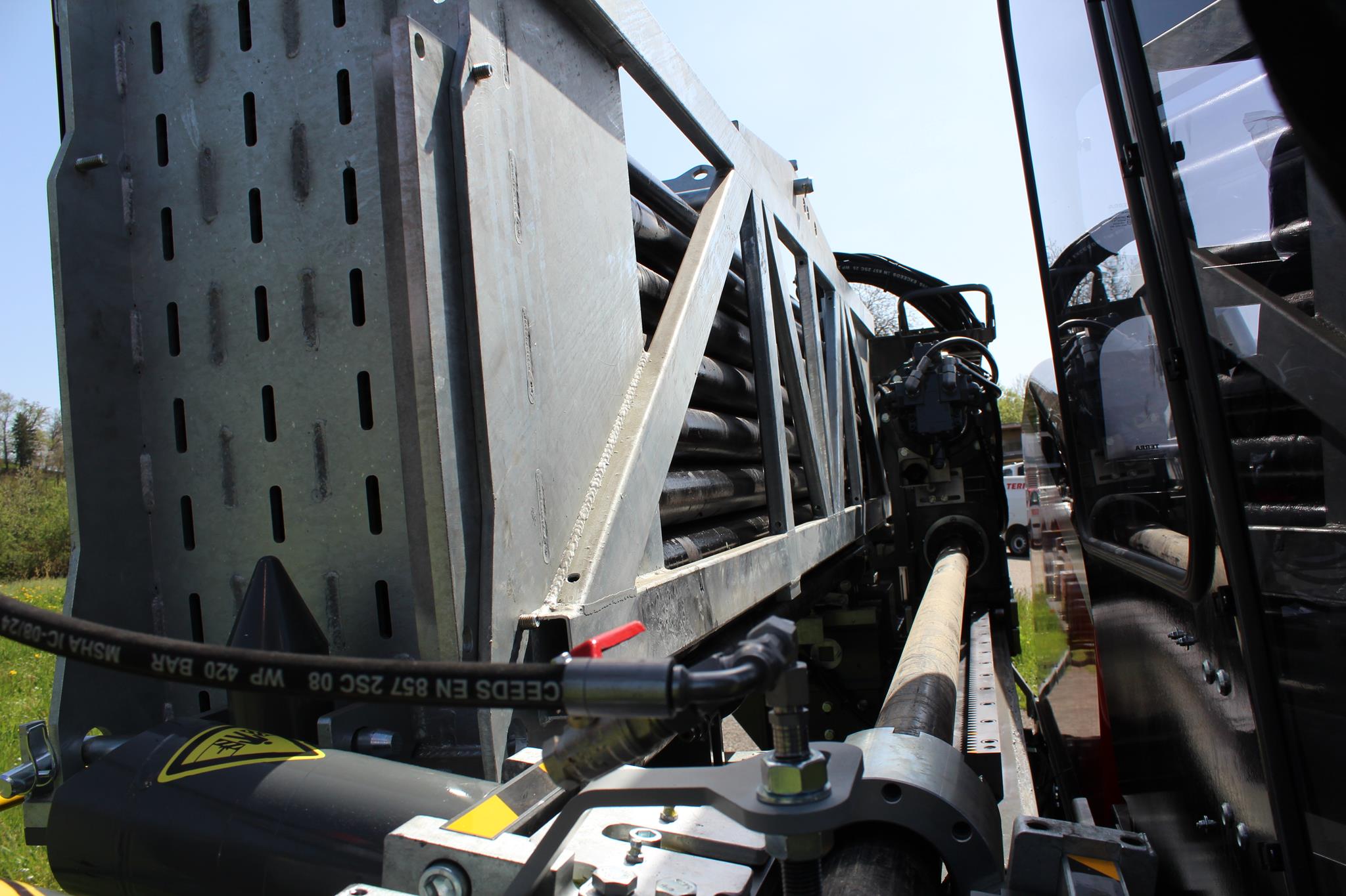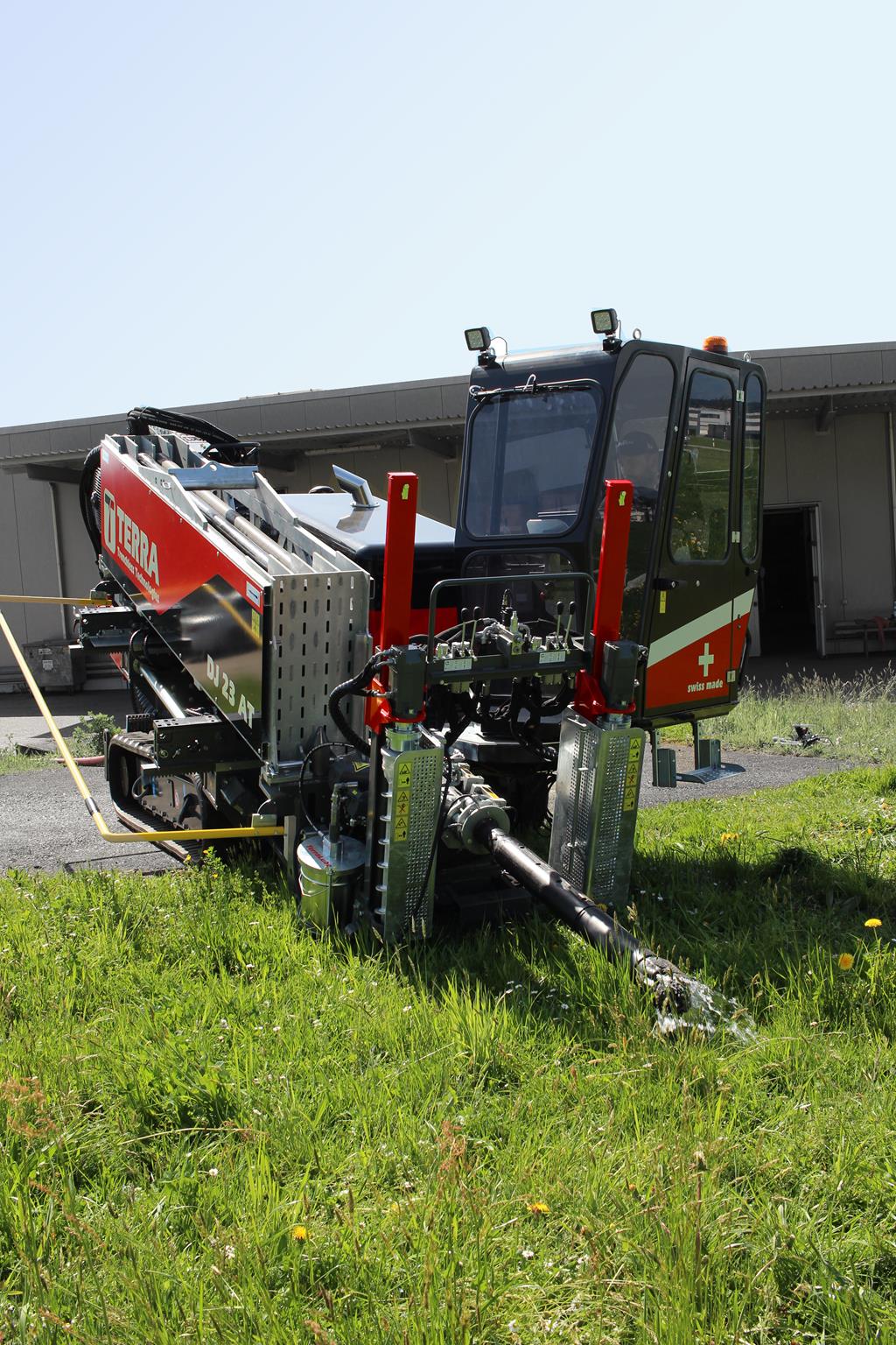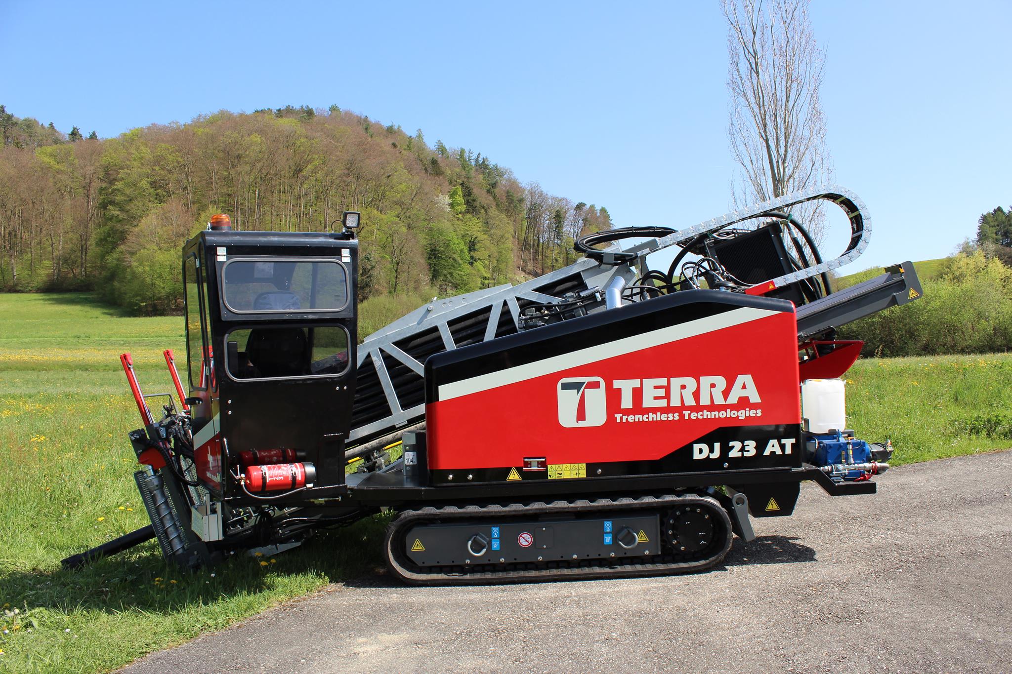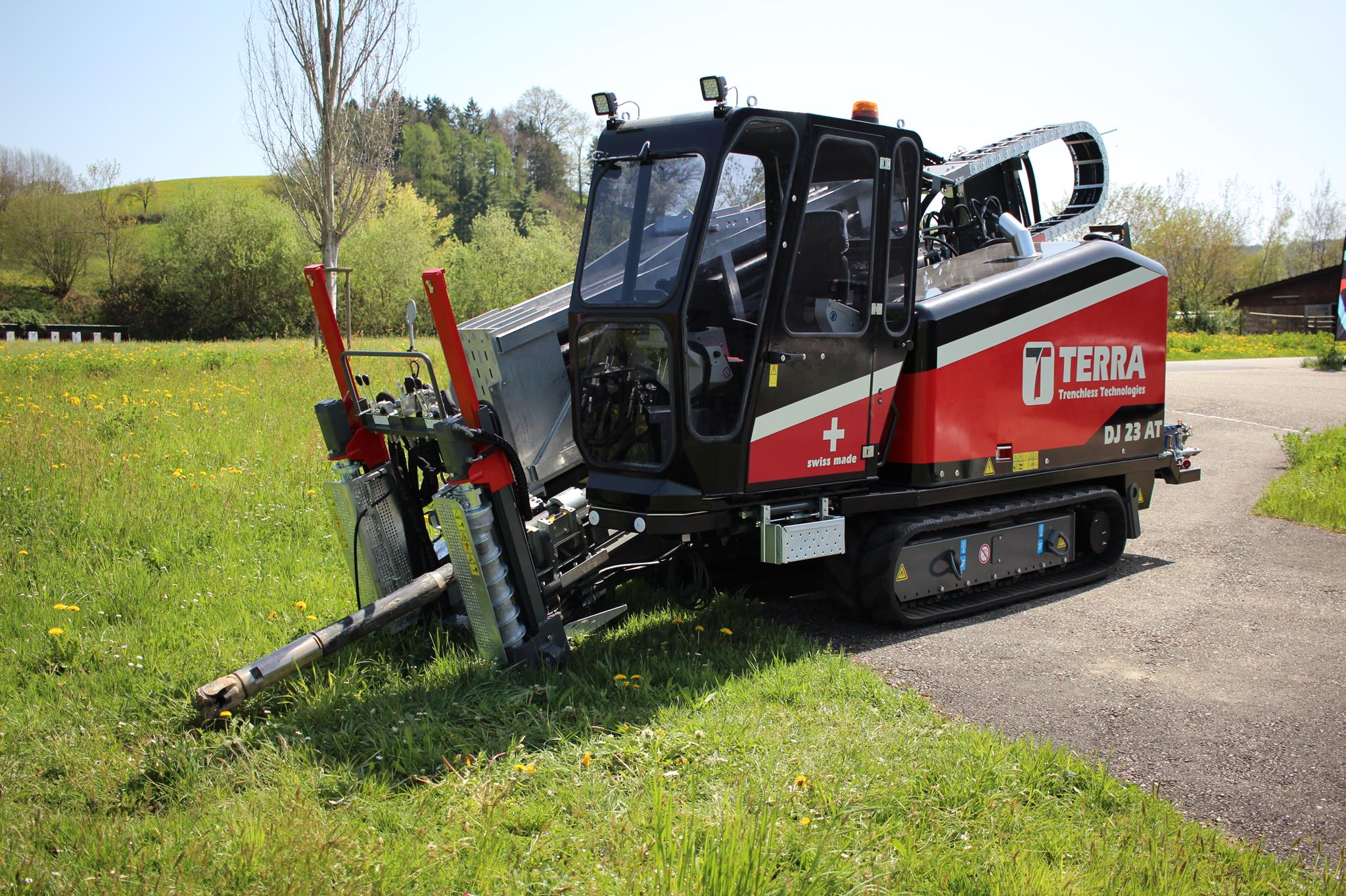 With the TERRA-JET DJ 23 AT, the Swiss engineers have developed a compact yet powerful rock drilling rig for directional rock drilling up to 100 metres in length. Equipped with a 101 HP strong Deutz diesel engine (Euro Stage 5), the DJ 23 AT delivers up to 11 tonnes of pulling and thrust force. The DJ 23 AT is equipped with a total of 36x dual rods, resulting in a total length of 103 metres on board capacity. The bending radius is 44 metres for aggressive steering in the ground.